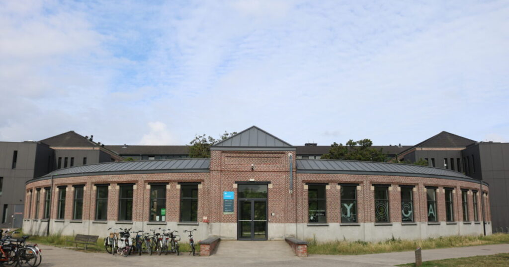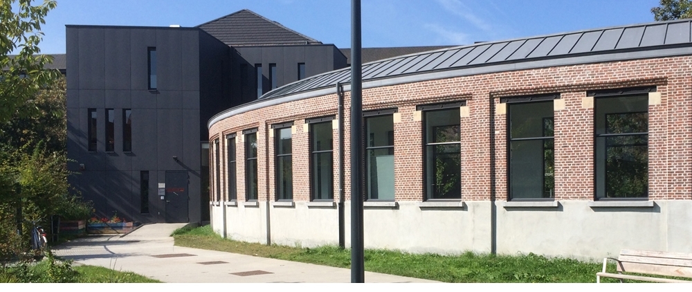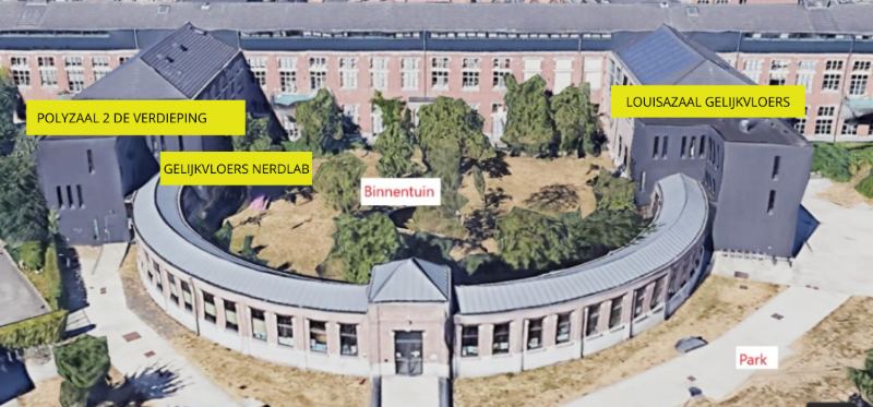Daar het parkje binnengaan en dan is het in het RONDE gebouw. In de linkervleugel: polyzaal op tweede verdieping – naam De Grote Modderkruiper.